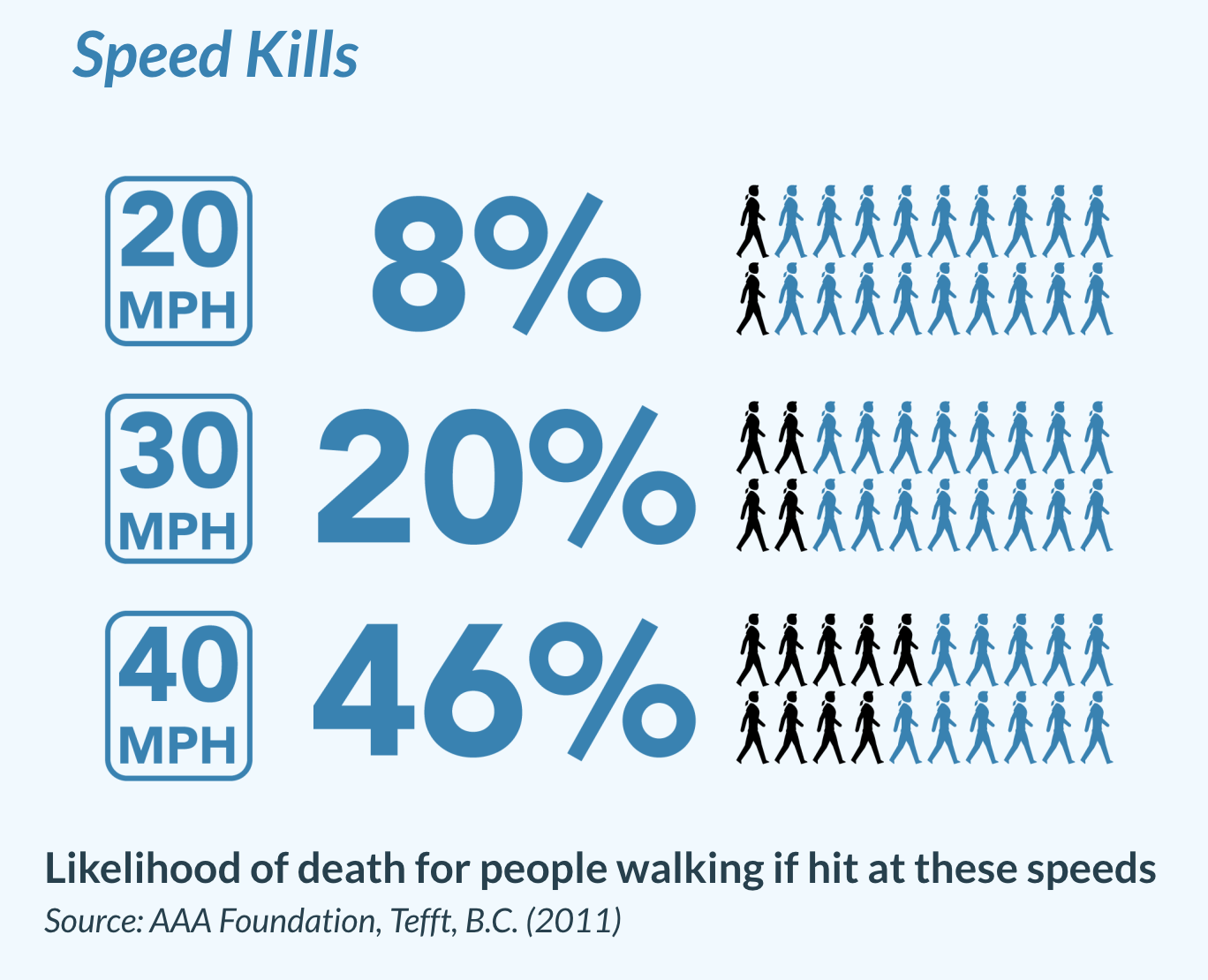 What changed, then? If crashes are becoming more deadly, the most likely culprit would be the vehicles, and the people driving them. Vehicle size and speed make a huge difference in whether a crash is survivable. This chart from the Vision Zero Network shows how crashes get deadlier with even small increases in vehicle speed: